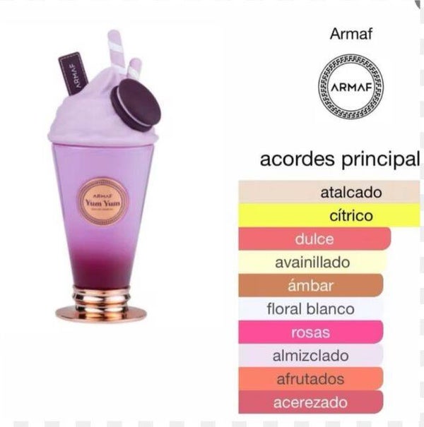 Yum Yum di Armaf è una fragranza del gruppo Floreale Fruttato da donna. È una nuova fragranza. Yum Yum è stato lanciato sul mercato nel 2024. Le note di testa sono Bergamotto, Arancia, Ciliegia e Bacche Selvatiche; le note di cuore sono Vaniglia, Rosa e Fiori Bianchi; le note di base sono Ambra, Muschio e Note Talcate.