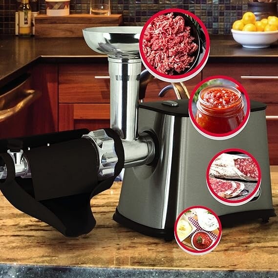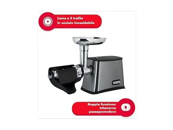 - MOTORE POTENTE E FUNZIONALE | Il tritacarne elettrico è dotato di un motore con una potenza in targa di 500W e di una potenza a motore bloccato di 900W. Il motore del passapomodoro e macina carne Ardes è dotato della funzione Reverse che permette di invertire il senso di rotazione in caso di blocco o salsa più concentrata.