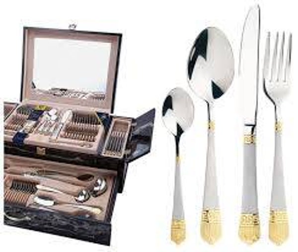 Posate in acciaio inox 18/10 in valigetta di lusso (72 pezzi) per 12 persone in oro