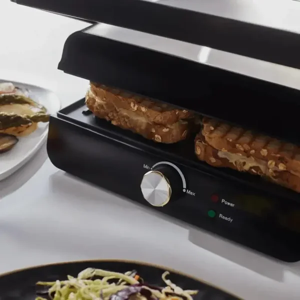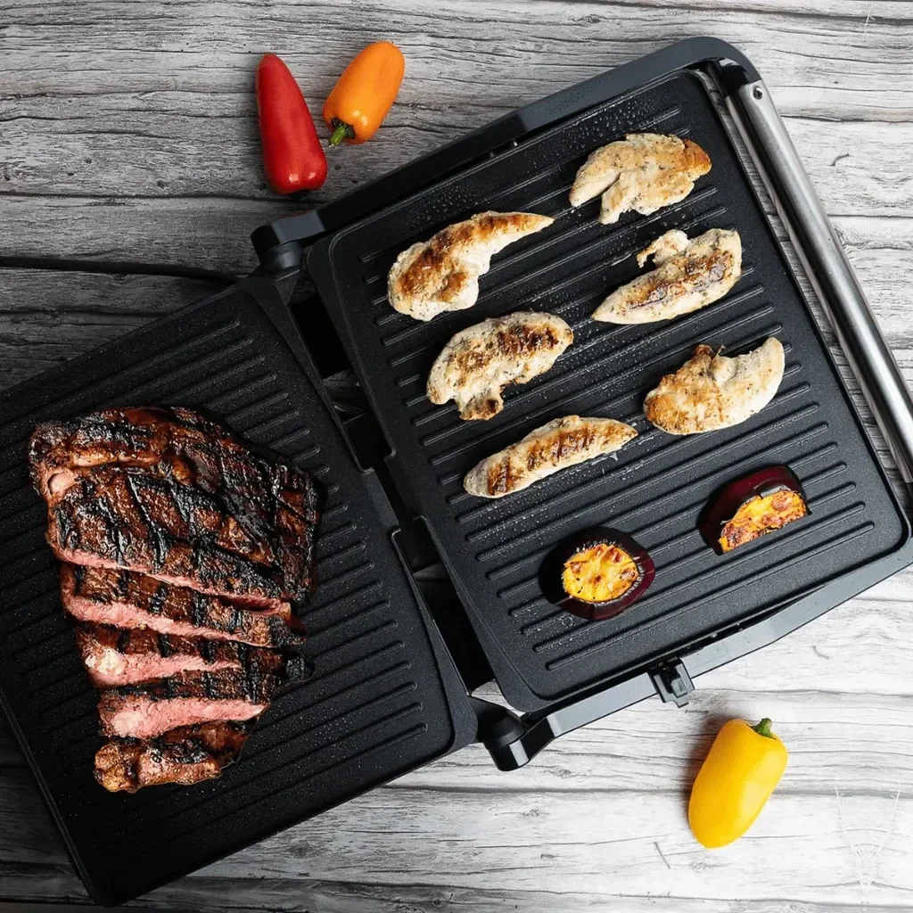 Il panini & contact grill Royalty Line, con la sua apertura a 180° e l'ampia superficie di grigliatura di 30 x 24 cm, offre un'ampia gamma di utilizzi. Il rivestimento antiaderente consente di grigliare a basso contenuto di grassi e di pulire facilmente. Grazie alla potenza di 2000W, il grill è rapidamente pronto all'uso ed è ideale per preparare panini, carne, pesce e verdure.